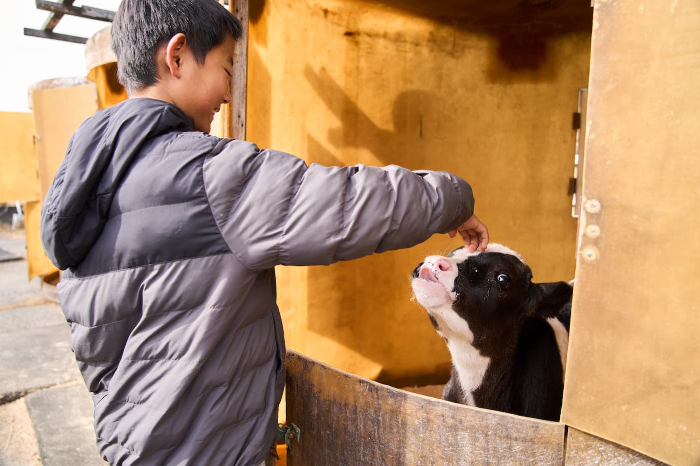 酪農体験で牛のブラッシングや世話を行う中で、生き物との触れ合いの楽しさを知っていく子どもたち。環くんは、運よく子牛の出産シーンに立ち会ったことがきっかけで、農場の獣医になる夢を持ったという。