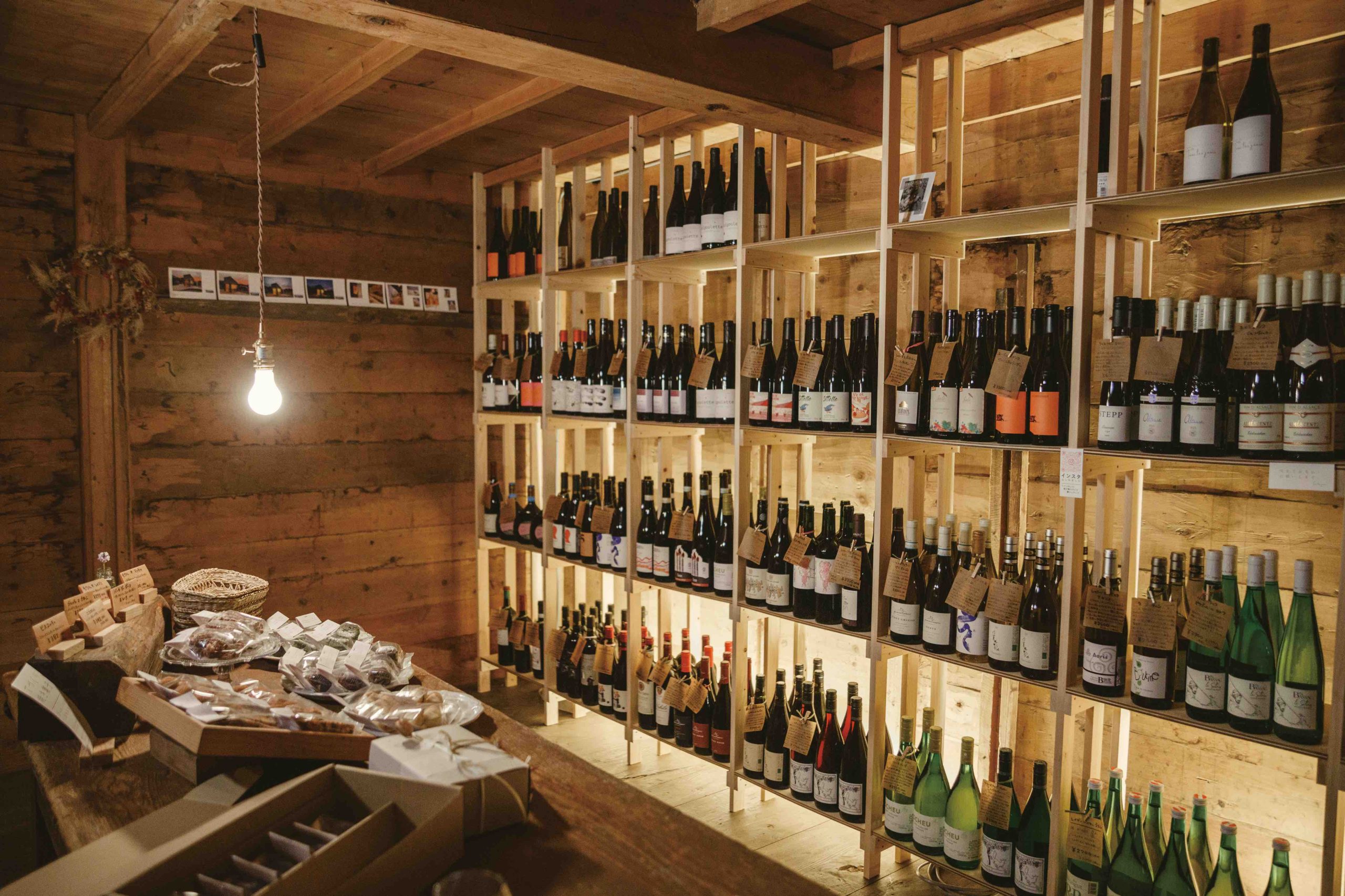 店舗にしている蔵は、扉を2回くぐって入る。真夏でも比較的涼しい。ワインはヨーロッパのナチュラルワイン主体で、価格帯は¥2000台から。「味わいや、つくりへのこだわりはもちろんですが、日々の食卓に取り入れやすいお値段にもこだわっています」(真子さん)。