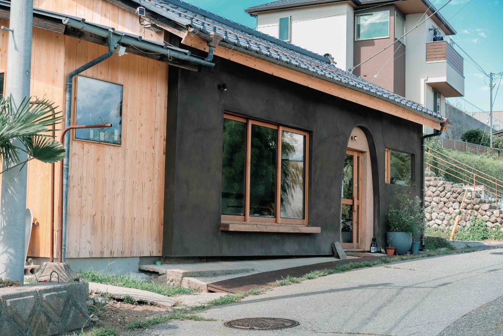 坂道に佇むシックな外観の『YORI COFFEE』。付き合いのある大工に依頼し、小さいながらも使いやすい店舗兼住居になった。