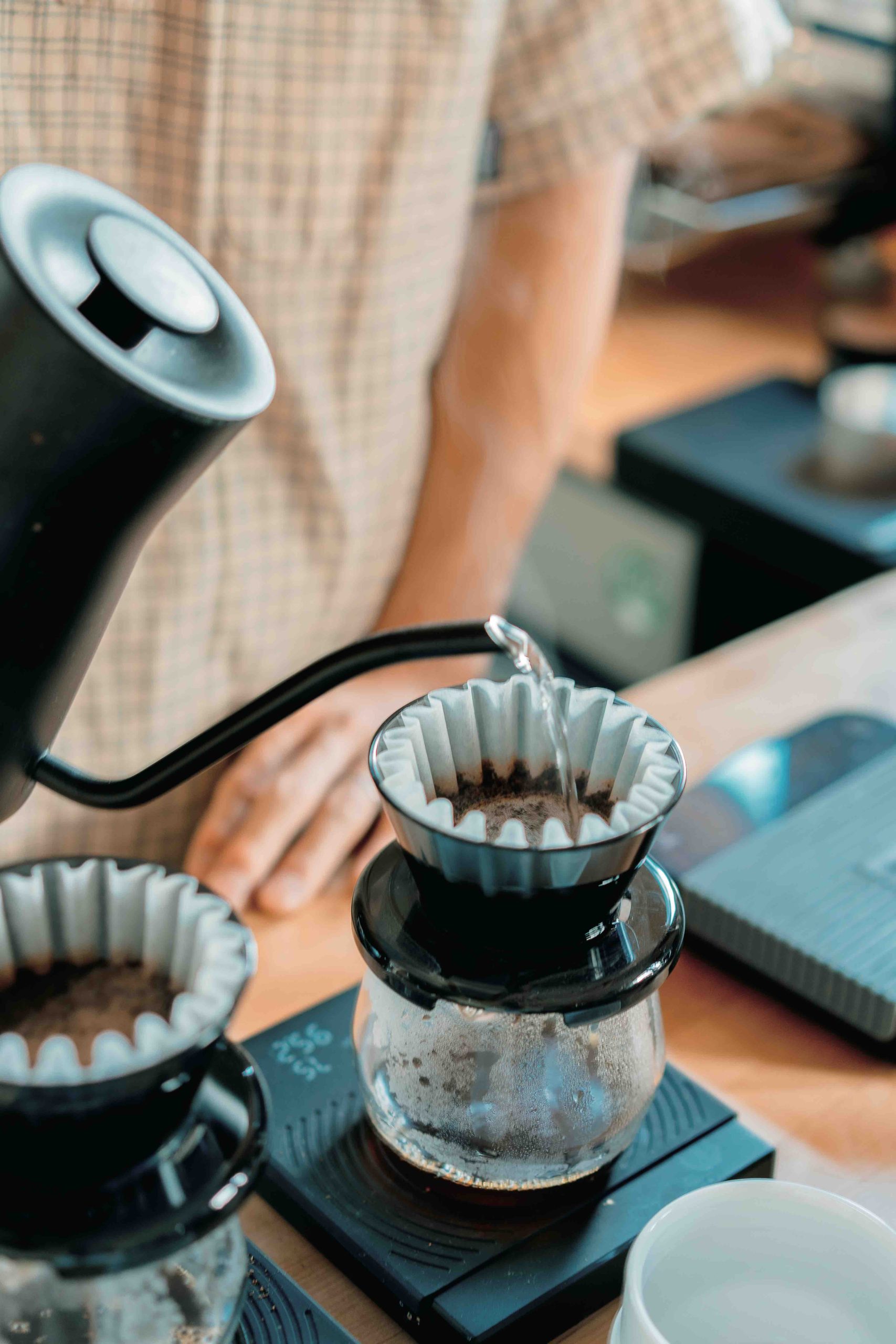 自家焙煎のコーヒーは、 浅煎りから深煎りまで扱い、こだわりの抽出器具で丁寧にハンドドリップする。