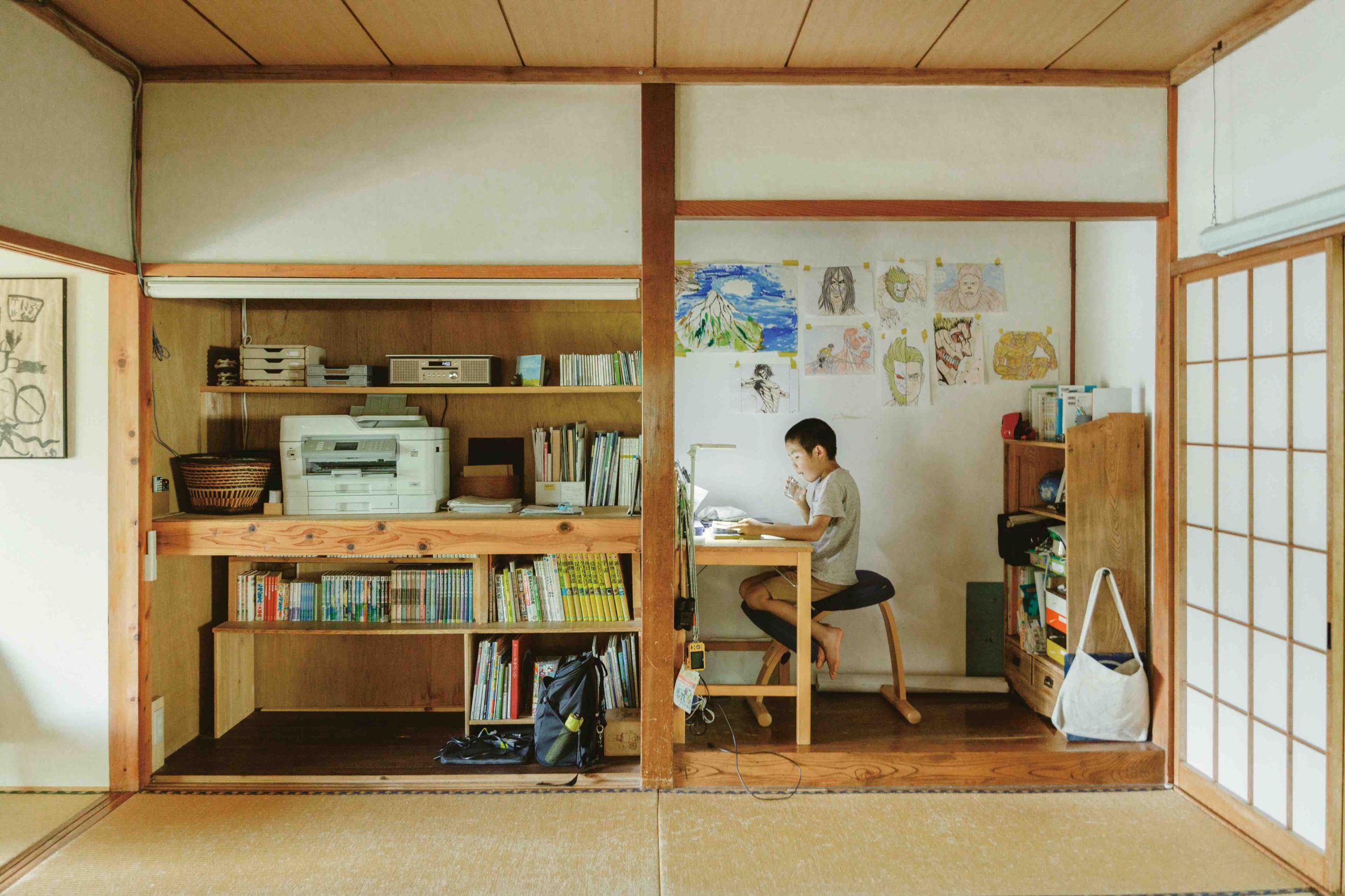 細部に宿る遊び心も共通している。ソファやローテーブルの足の下には、山越さんが縫った丸い小さな〝お座布〞が敷かれている。壁には長男・創介くんの作品である絵や厚紙版画が。思わず笑みがこぼれる〝余白〞に、山越さんの暮らしにかける愛がにじむ。