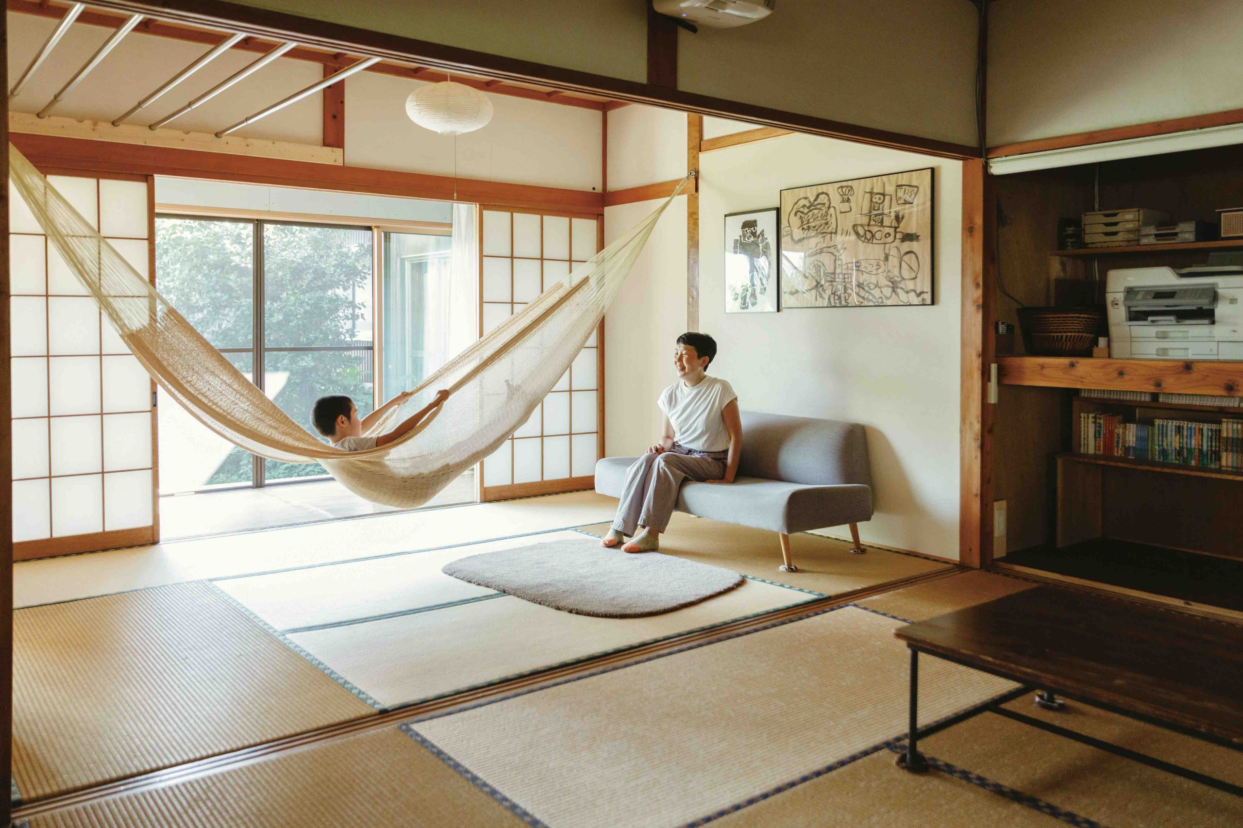 畳敷きのつづきの間。ハンモックに揺られるのが創介くんのお気に入り。部屋の余白は、洗濯物を畳んだり、ヨガをする為に広めに確保しているそう。