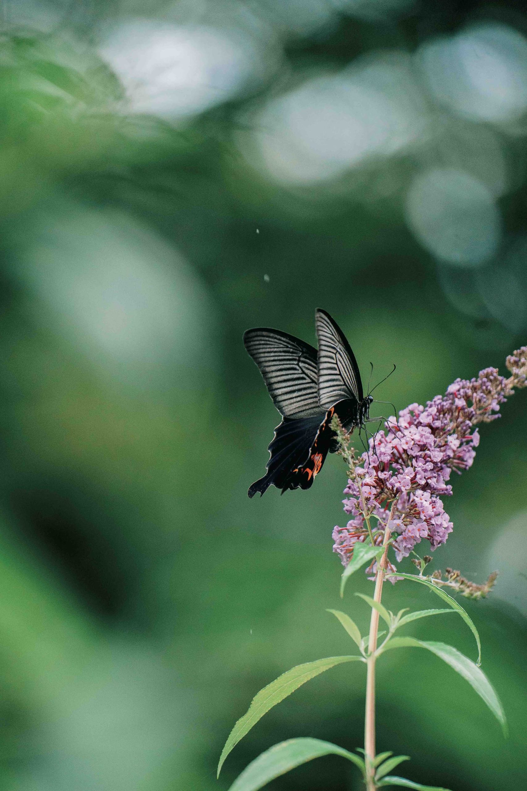 フジウツギの花にとまるクロアゲハ。小川が流れる音に、鳥や虫の声が賑やかに重なる。
