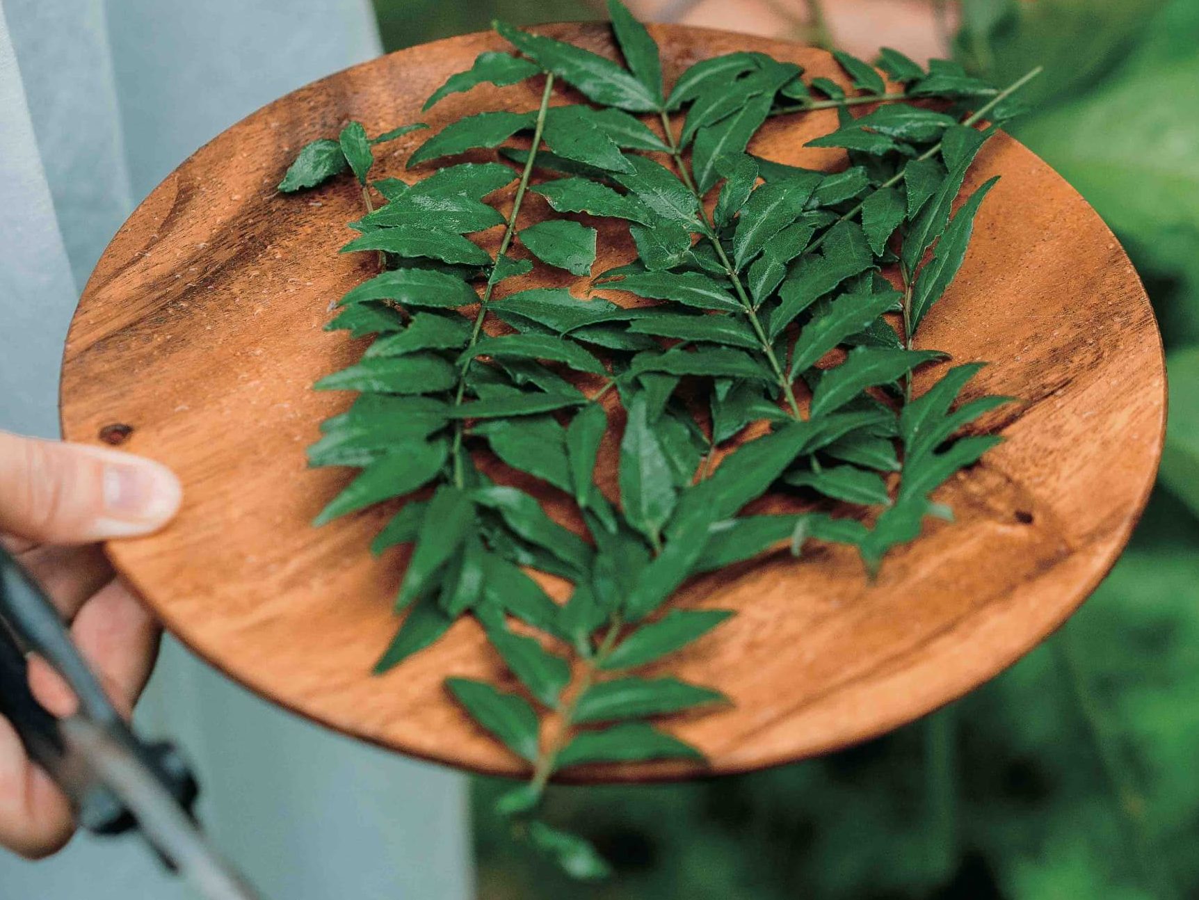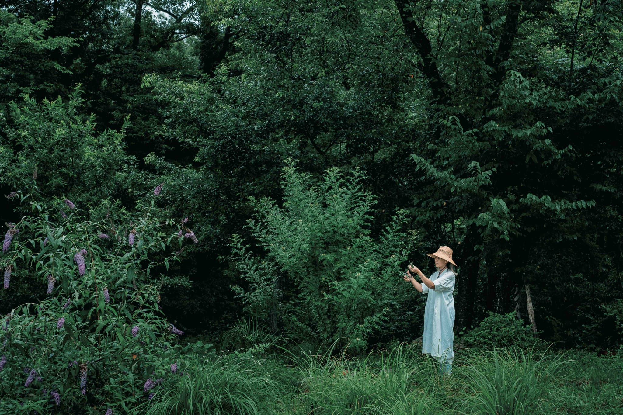 「すごくいい香りがするんです」と言いながら、自生した木の葉っぱを摘む舞さん。山椒の葉に似ていて柑橘系のスッとする香りがすることから、おそらく「ブドウサンショウ」と思われる。